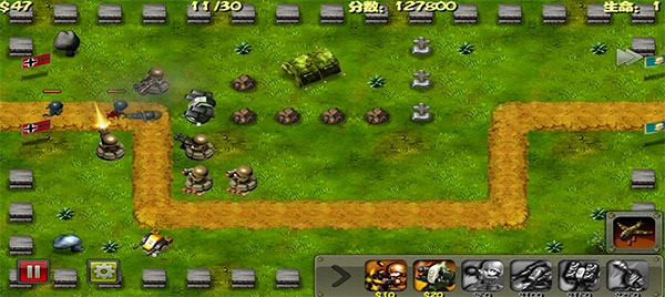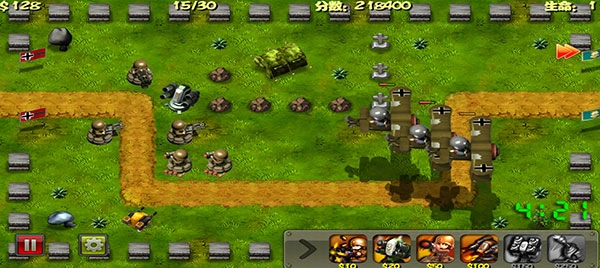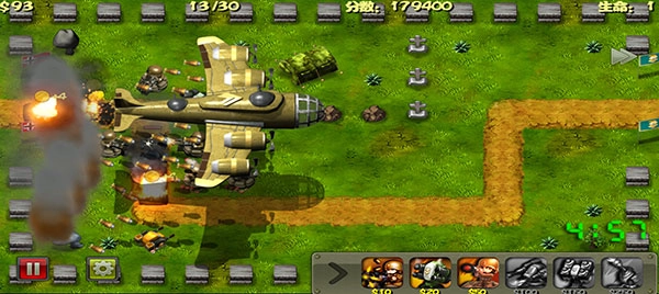 消耗金币来部署不同兵种:步兵适合在前线承担消耗任务,火箭炮专门针对集群目标进行打击,歼击机则负责拦截空中单位。