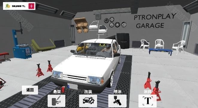 点击“改装”按钮,即可进入赛车改装界面,该界面包含悬架、涂鸦、喷漆和改装四大模块。