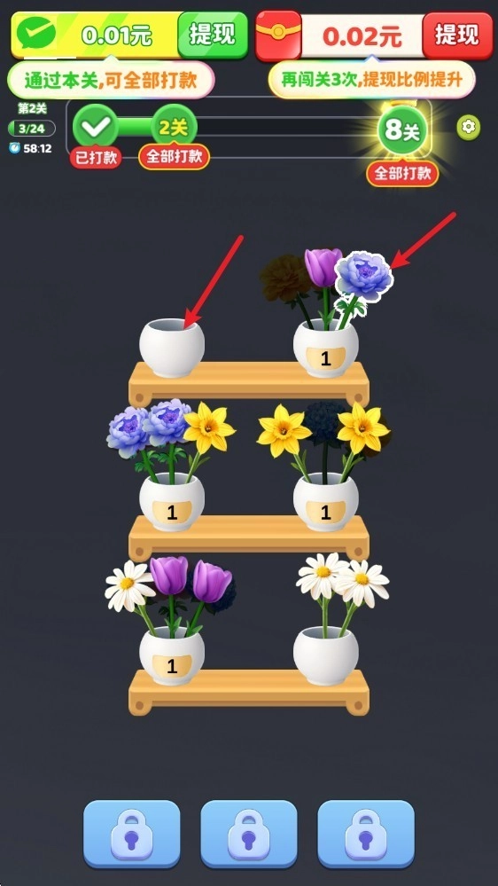 当花瓶中放入了三朵相同的花就会自动的消除。