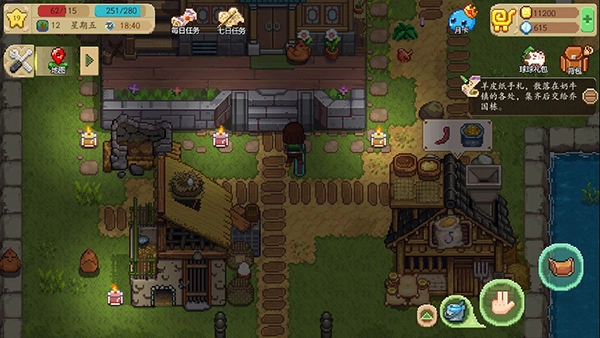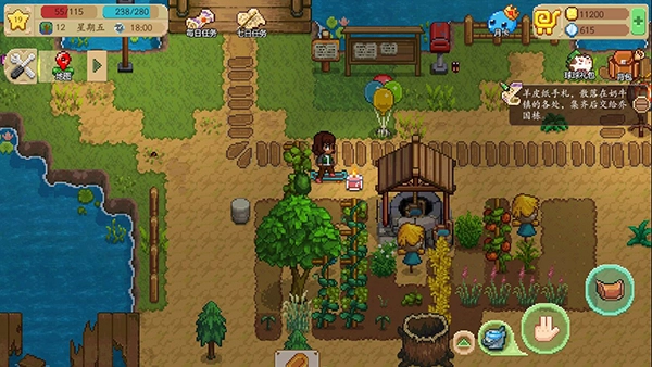建议把带架子的作物种在离屏幕最远的那一排,树木则种在边上,不然浇水锄地时会发现根本看不清植物在哪儿(提醒一下,不浇水的话植物是不会继续生长的)。物品耐久耗尽后,可以用修复石来修复,操作方式是点击背包里对应的物品。水壶没水时,选中水壶后到池塘边点击池水就能装水。换季时,普通植物(应季树木除外)都会枯萎死掉,没完成的订单可以用魔法植物来交付(魔法植物在金币旁的加号按钮里,需要用钻石购买)。