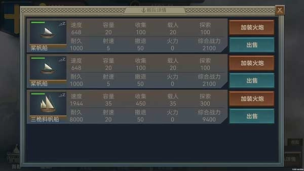 进入“舰队详情”页面,能够查看所有战舰的相关信息,并且可以对其进行加装火炮的操作,也支持一键出售;而在“造船厂”里,玩家可以使用金币来打造更高级别的舰只。
