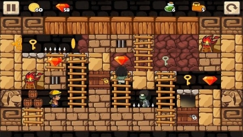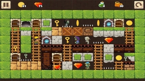 玩法趣味探索:控制探险家在地下神殿中挑战关卡,需要寻找钥匙来打开通关之门,在此过程中收集钻石,每一次发现关键道具都能带来满满的惊喜。