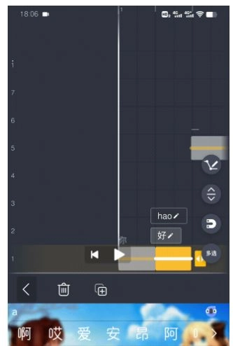 调音时,只需按照简谱上的数字,在屏幕对应的位置点击即可。可以先直接点击感受一下,准备就绪后,点击右下角的录制按钮开始调音。建议将左下角的倍速调整为0.5,否则速度太快,按不过来会增加后期工作量。要注意简谱中的“—”表示长按前面的数字。如果唱错了,可向右滑动,点击右侧的“x”删除错误的歌词。