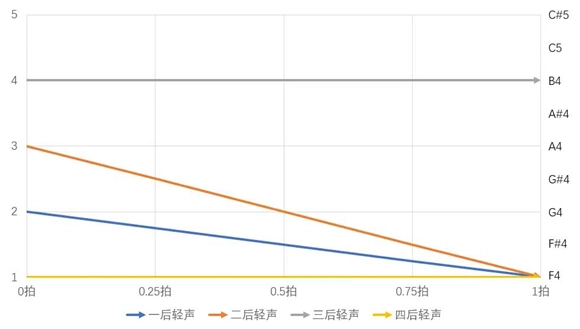 在通常的歌曲里,多数都以四四拍(也就是以四分音符作一拍,每小节有四拍)为主要节拍,四四拍对应的强弱规律是重、轻、次重、轻。重拍位置上,出现频率最高的声调是第四声,每句话的最后一个字一般是第一、二、四声,而第三声常常处于轻拍,很少被放在重拍和句末的位置。有时候为了贴合节奏感,重拍上的字还会被硬性唱成第四声,一些被安排在重拍和结尾处的第三声汉字也会被强制变调。句子当中,轻拍或者时值较短的字音变化往往会被简化(具体可参考第三章语调的缩略部分),对于轻拍上的声调完全可以进行弱化处理,或者干脆不做声调处理,直接把音高往下拉一段距离,使其成为音调稍低的第一声就行。句末重拍且时值较长的声调则需要完整地表达出来。要是时值太长,应该考虑将它缩短,毕竟说唱和日常说话都不会把一个字拖得特别长。