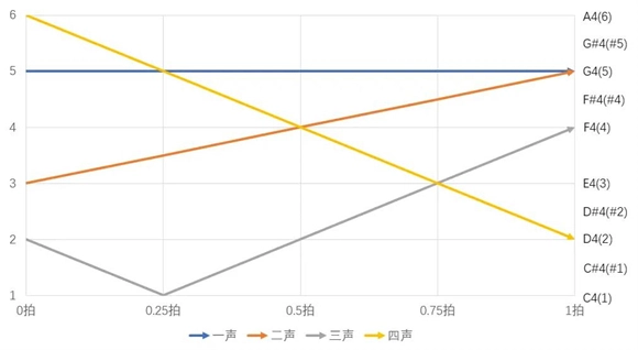 首先,我们需要熟悉五度标记法,其中阴平对应第一声,阳平对应第二声,上声对应第三声,去声对应第四声。这里的五度是相对概念,不存在固定的音调,五度之间也没有绝对明确的音程。不过在ACE中,若要调整念白,五度之间的音程间隔建议设置为一个全音,同时第四声最好在原有基础上向上移动两个半音。