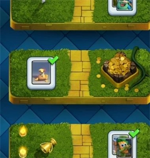 在对战中,胜利的一方能赢得金币、宝箱与奖杯作为奖励;若不幸失败,则无法获得任何奖励,还会被扣除部分奖杯。玩家积累奖杯可升入更高等级的竞技场(段位)。宝箱需等待一段时间解锁,开启后能获得金币、钻石、卡牌等道具,不同类型的宝箱,开出的物品数量也各不相同。