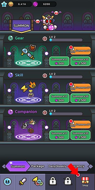 在商城里点击召唤按钮,就能抽取并升级武器。要是任务没完成也不用慌,只要把游戏放着挂机,就能提升史莱姆的属性啦。