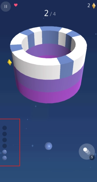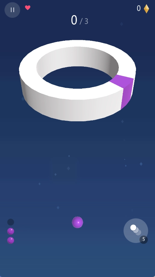 随着关卡的不断提升,旋转的圆环会逐渐加快速度,同时空白区域也会慢慢缩小,而左侧的数字则会实时展示剩余彩球的数量。