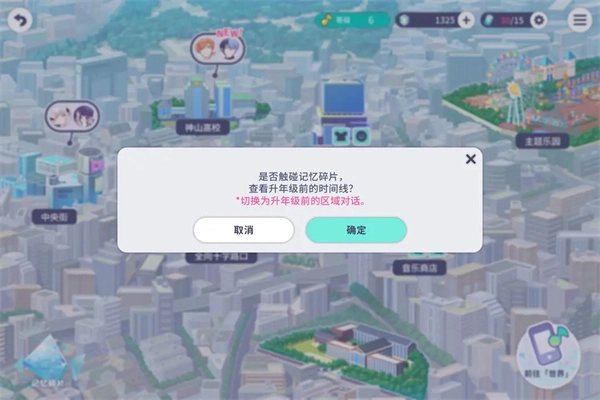 地图上会随机出现人物对话剧情,标有“New”的对话在观看完毕后可领取10水晶(支持跳过)。把地图上所有对话依次点击一遍,接着点击右上角的“标题”按钮返回标题页面,再次进入游戏就能刷新对话内容。提升区域道具等级、参与演唱会或进行打歌也能实现相同的刷新效果。地图左下角设有“记忆碎片”功能,点击该功能即可查看三周年更新前的人物对话记录。