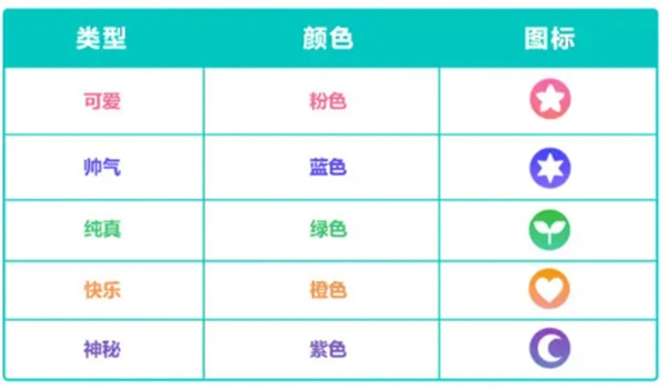 每名成员都被分配到下表列出的5种类型之一,类型图标会显示在成员完整图的右上角或缩略图的左上角。当玩家等级达到25级时,就能在现实世界的神山高校与宫益坂女子学园,使用奇异种子兑换带有对应类型加成的区域道具,这类道具可增强拥有相应类型成员的综合力。