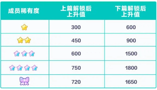 解锁“上篇”并完成首次观看后,成员综合力会提升固定点数,还能获得25个水晶的角色剧情奖励;解锁“下篇”并完成首次观看后,成员综合力同样会提升固定点数,同时可获得50个水晶的角色剧情奖励。解锁“下篇”需先将成员特训至满级,且已观看完“上篇”。每篇角色剧情的奖励仅能领取一次,解锁角色剧情后成员综合力的具体提升数值为:
