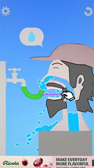 后续关卡还会出现液体相关的元素,就像下图里这个给大叔喂水的场景(用水管来实现真是个天才点子)