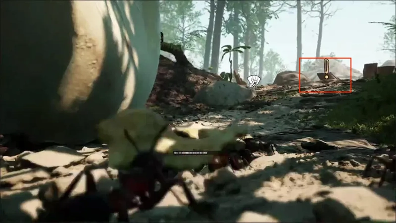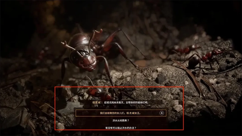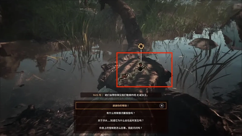 2、在树干上有一只小蚂蚁——9615号,它告诉我们女王塔尤在等待主角的觐见,在9615号这里我们还可以得到另一个消息就是塔尤岗即将遭受洪水,紧接着继续往前就到了塔尤女王的巢穴。