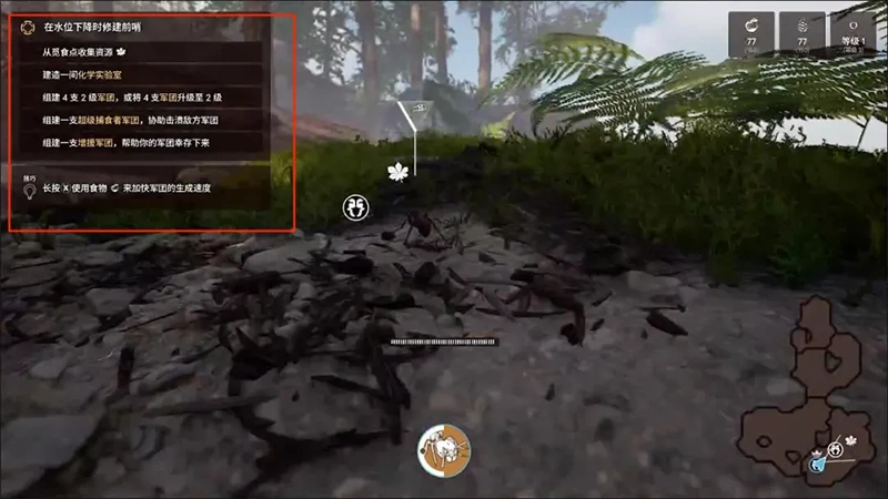 玩家需要指挥蚂蚁采集食物、水、木材和矿物之类的资源。借助科学规划运输路线,确保资源能够持续供给。刚开始时要优先搭建蚁巢,接着解锁化学实验室、制图师升级屋这类设施来对蚁巢进行升级。