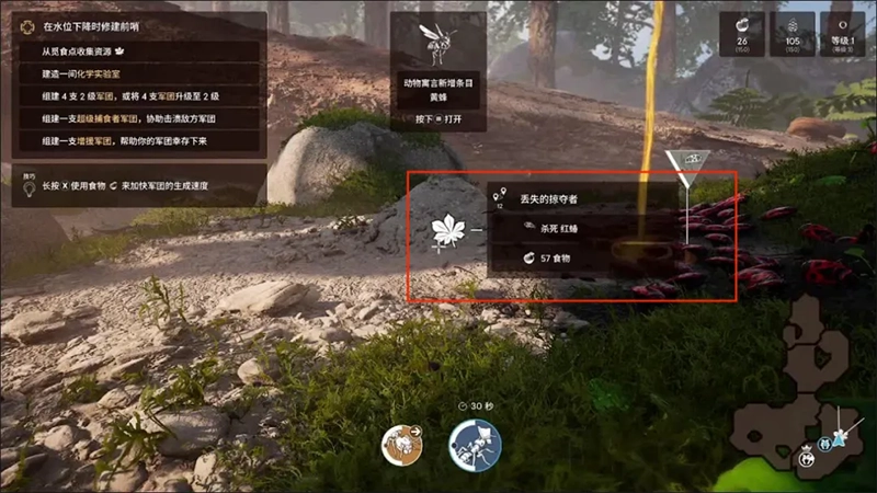 4、从女王的巢穴出来不远处有一个大树桩和一个巨大的感叹号,上去之后和230196号对话我们要帮助塔尤岗找到一条迁徙的道路,那条路途径了白蚁的领地,白蚁并不是谈判的好对象,想要通过只能占领它们的领地开出一条路。