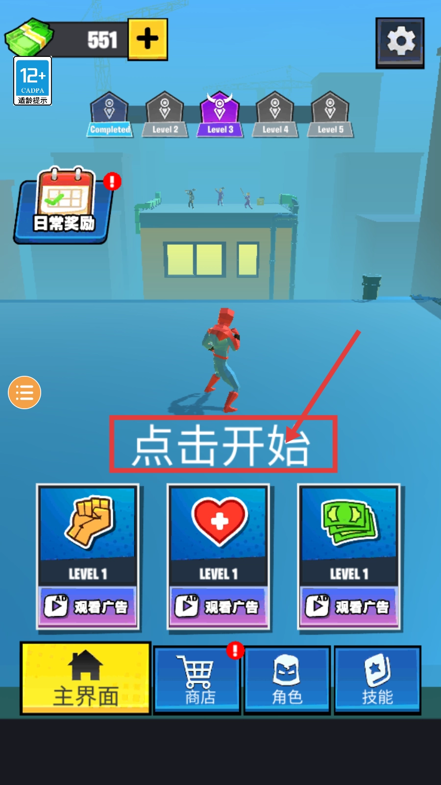 请注意12+-CADPA适龄提示,点击【点击开始】即可进入关卡,别忘了领取【日常奖励】来获取资源。