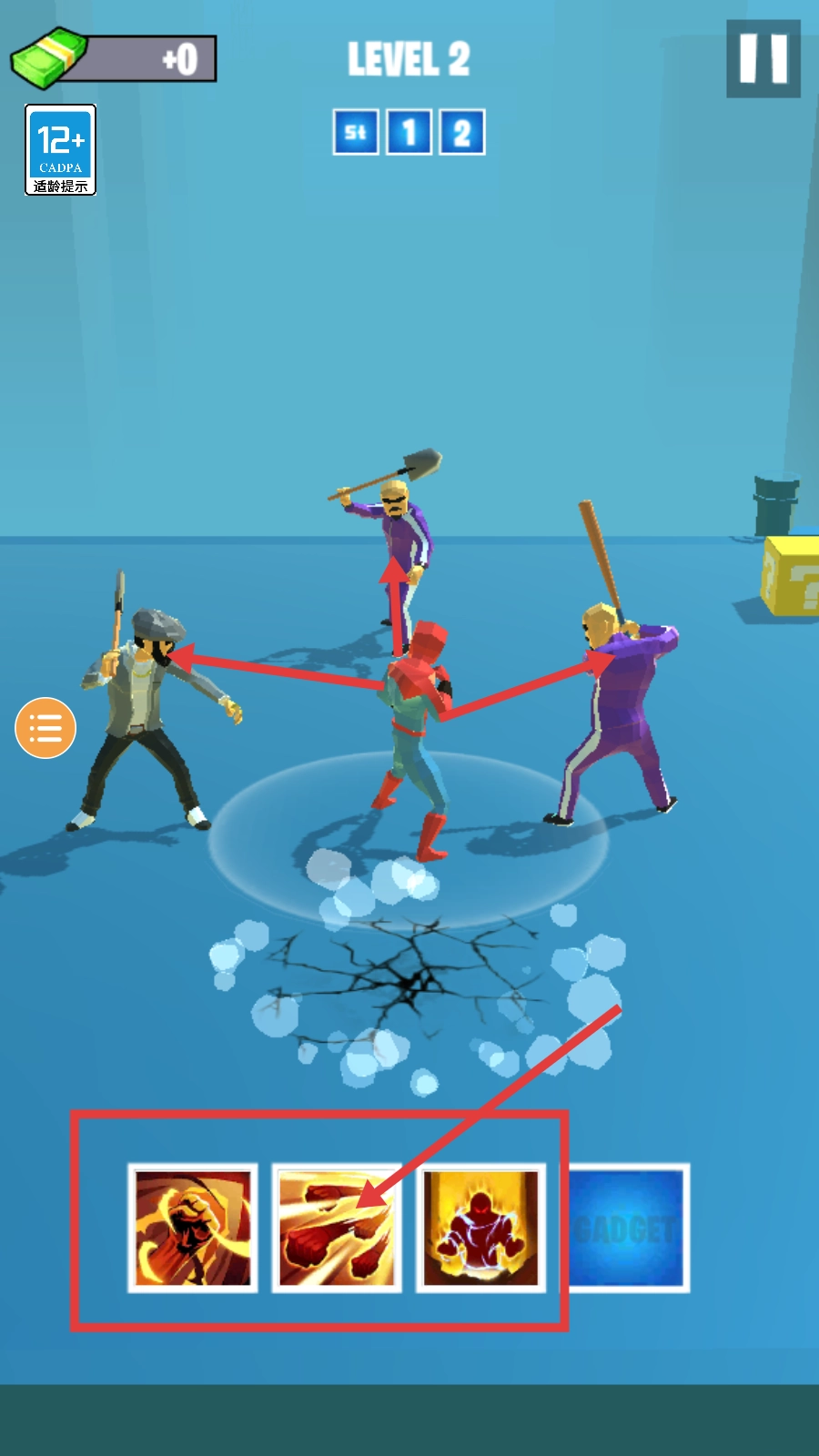在LEVEL2战斗时,借助下方的技能图标来释放技能,迅速击败多个敌人以推进关卡。
