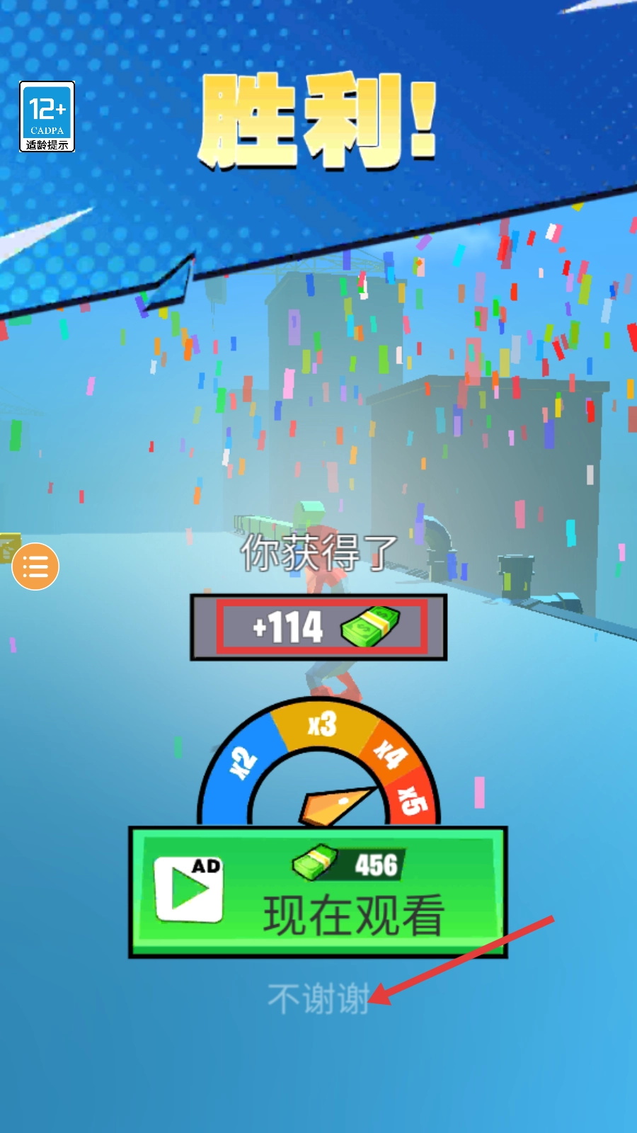 通关后获得114张钞票,要是不想看广告的话,点击【不谢谢】就能继续下一关攒更多资源。