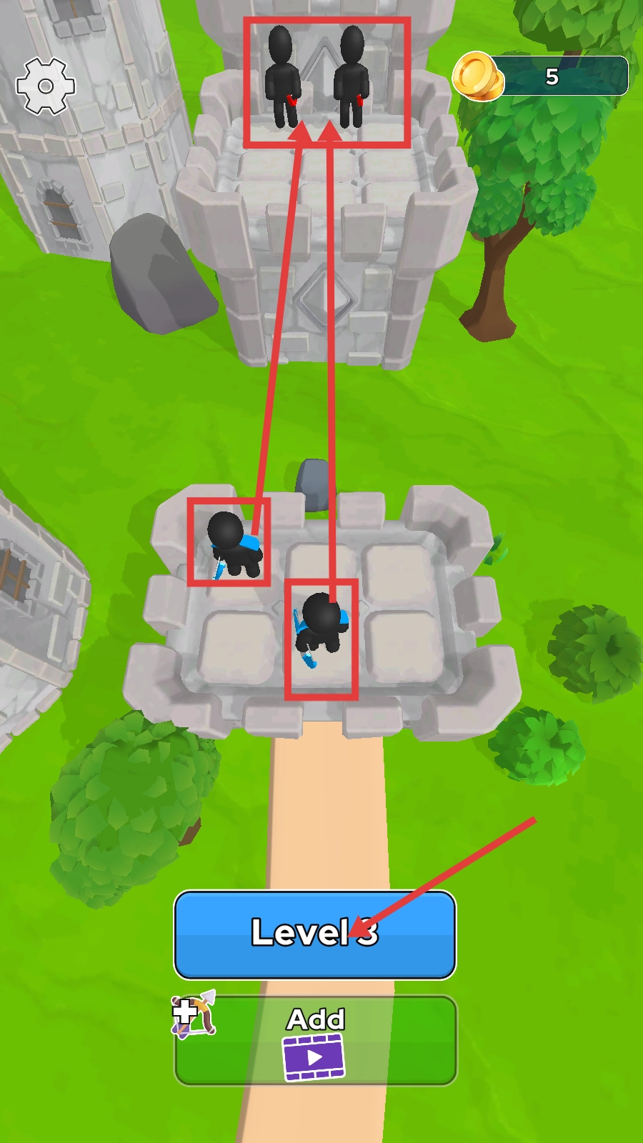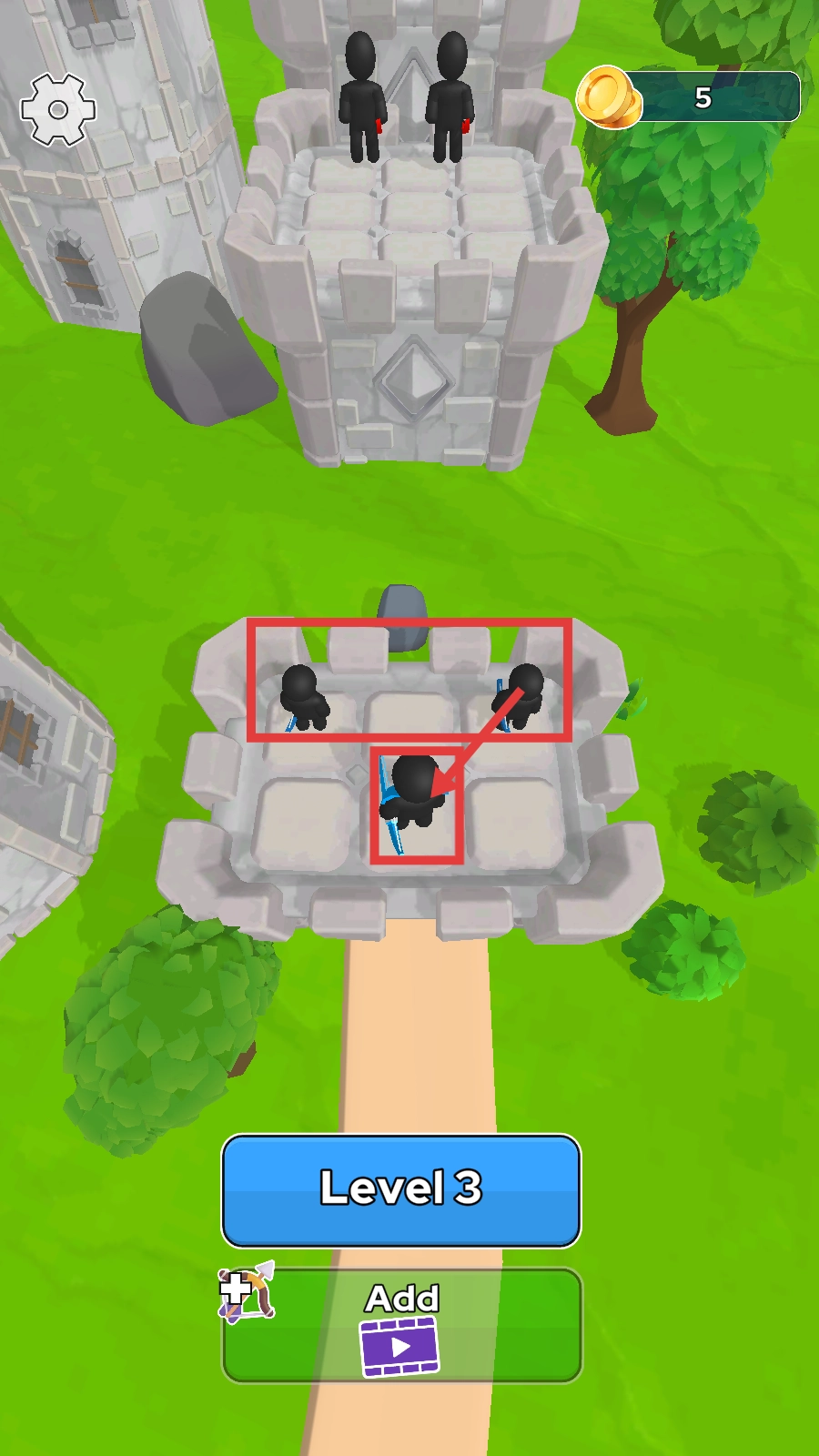 升级到【Level-3】后,留意我方和敌方城堡的布局情况,安排三名持箭的小人,完成战斗前的人员部署准备工作。