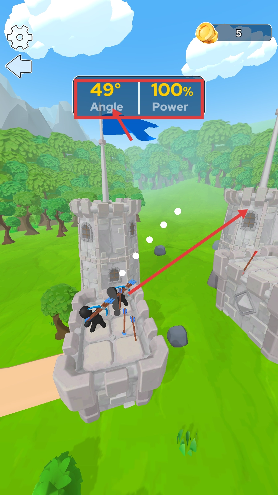 调整【Angle-49°】与【Power-100%】,精准锁定敌方城堡,把控箭矢飞行轨迹以提高命中概率。