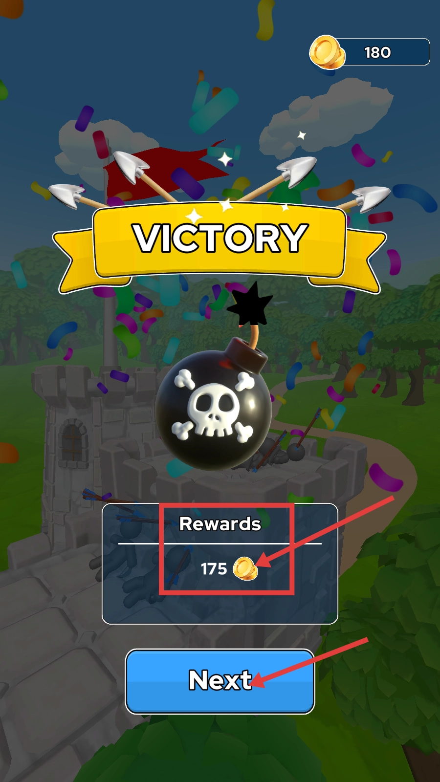 战斗获胜后,可领取【Rewards-175金币】,点击【Next】按钮进入下一关,所获资源将用于后续的升级与强化。