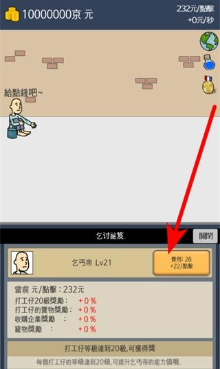初始阶段可以点击乞讨秘笈中与乞丐帝相关的内容,花费对应的费用来提升等级,等级提升后能增加每次点击所获得的京元数量,从而帮助积累初始资源。