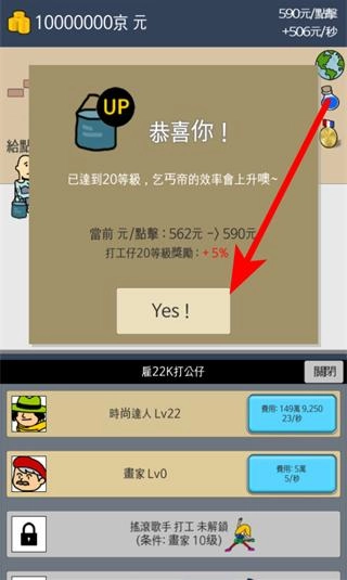 当打工仔的等级提升到特定阶段时,会弹出等级奖励的提示窗口。玩家点击“Yes”确认领取后,可获得相关效率的提升效果——例如,乞丐帝的工作效率会随打工仔等级的提高而增加,从而让京元的获取速度进一步加快。