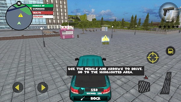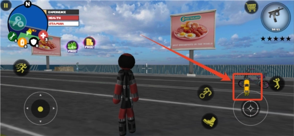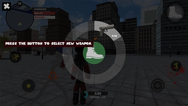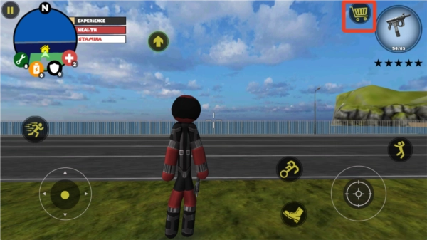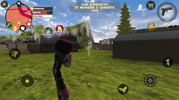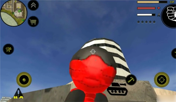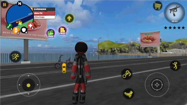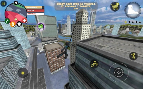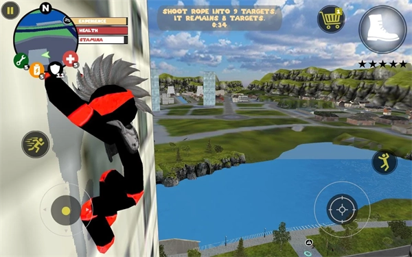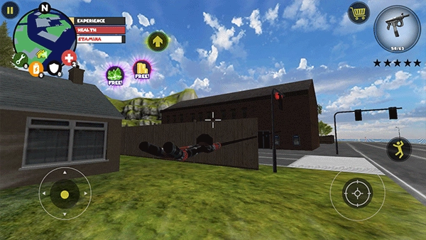 左侧负责移动与加速操作,右侧对应绳索和攻击(跳跃)功能,常规跳跃键独立设置;右上角的武器切换界面,连同血量、经验的动态数据都清晰呈现、实时更新。玩家可自由选择玩法风格,与其他帮派成员展开激烈交火——击杀敌人能获取经验值,连续击杀积累到一定数量会触发星级通缉,届时警察与周边角色将对你发起针对性猛攻。你的核心目标便是在这场混乱中设法存活,并完成对其他对手的击杀任务。