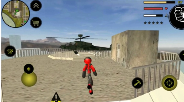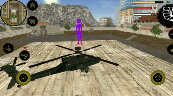 可以看到楼顶上停着一架直升机,你需要驾驶这架直升机飞往巨型火柴人所在的位置。