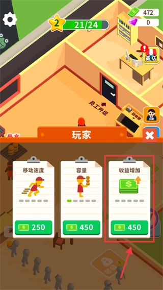 优先升级【收益增加】功能,消耗450金币,以此提升店铺的收益水平,加快资金积累速度,从而为后续的发展提供有力支持。