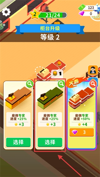 柜台升级时,建议选择【雇佣专家-速度加25%-星星加3】的绿色柜台,这样能提升雇佣速度,从而保障菜品供应。