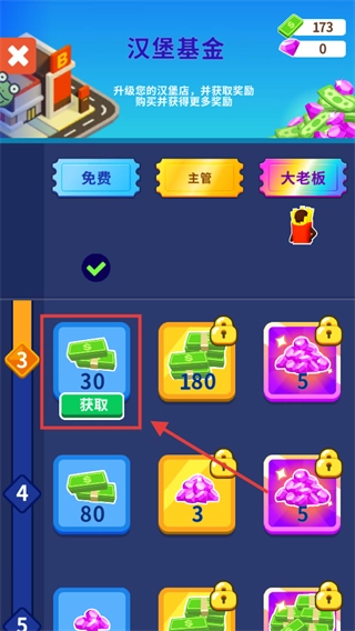 在【汉堡基金】页面,找到免费区域里显示【30】金币的【获取】按钮并点击,就能领取奖励来支持店铺发展啦。