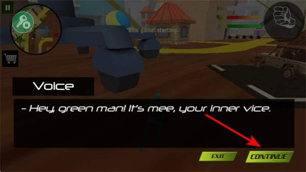 当出现剧情提示界面时,点击CONTINUE按钮来推进剧情,这是解锁游戏内容和了解故事背景的重要操作。