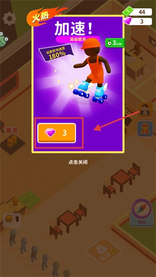 可消耗【3】钻石购买加速道具,让移动速度提升【180】%,以此加快服务节奏,进而提高营收。