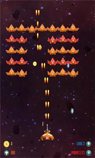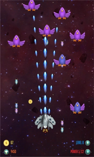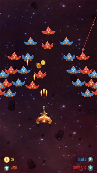 进入关卡后,屏幕左右两侧会飞出整齐排列的小鸡,我们需要操控飞机对它们发起攻击。