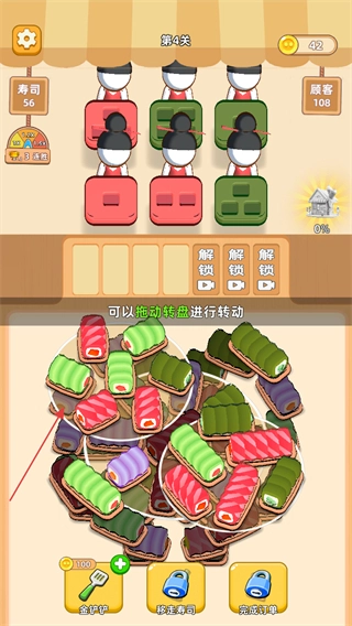 转动托盘即可获取被压在下方的寿司,根据顾客的需求点击寿司就能完成售卖。