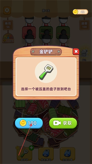 当上方没有空位放置寿司,且必须借助被压在下方的寿司才能打开局面时,你可以消耗金币使用便捷闯关道具来解决问题。