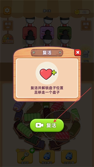 闯关失败时,你可以选择观看视频来复活,同时解锁一个盘子的位置,这样就能保存你的连胜记录了。