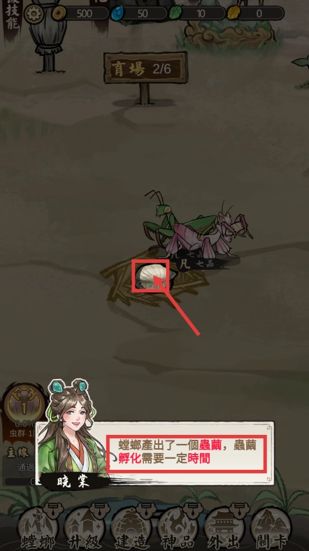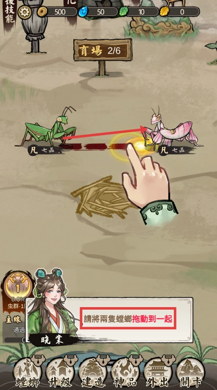在育场里,按照指引把两只螳螂拖拽到一起进行配对,就能启动繁殖操作。