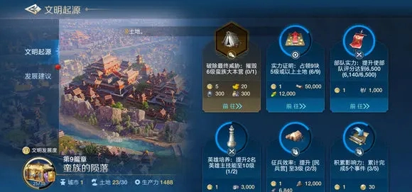 0~10到10分钟:新手引导阶段,进入游戏后跟着指引完成基础教学,解锁主线任务。所有建筑的升级都要按照主线任务的要求来进行(避免浪费资源),土地的攻占也根据任务需求去完成。