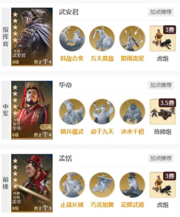武安君定位为输出型弓兵武将,普攻距离为4格。其核心技能【料敌合变】是开场触发的定向攻击技能,生效距离5格,发动概率100%——该技能会对带有控制效果(涵盖缴械、沉默、混乱、眩晕、嘲讽、力竭)的敌人造成100%攻击伤害,且伤害可随敌方身上的控制效果数量叠加,控制越多伤害越高,堪称精准打击的“巡航导弹”。 不过武安君的下限较低,上限却极高,几乎必须与具备控制技能的英雄绑定,或是自身携带控制手段才能发挥作用。推荐搭配组合包括:武安君+华帝+孟恬(可触发命运效果)、武安君+军神+孟恬(可触发命运效果)、武安君+华帝+波拿巴。搭配时需注意:队友必须是控制稳定且控制类型丰富的英雄,若缺乏控制效果支撑,武安君的作用会大打折扣,近乎“作废”。
