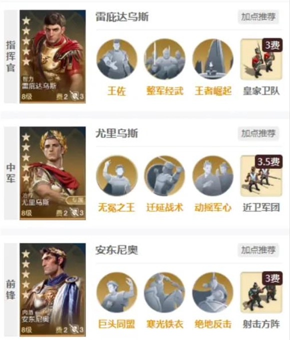 尤里乌斯肉队:成员包括雷庇达乌斯、尤里乌斯与安东尼奥。该队伍围绕尤里乌斯构建核心体系,在选择武将时,优先考虑提升队伍的坦度与作战稳定性,主动技能的配置则尽量精简。