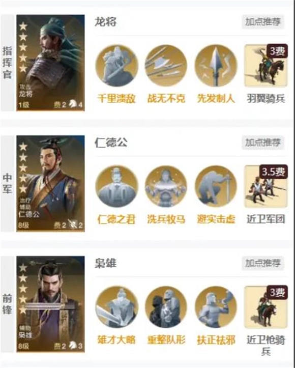 三国队阵容配置为龙将、仁德公与枭雄:核心输出龙将依赖叠层机制触发效果,仁德公与枭雄可提供高额叠层,配合先发制人特性,能稳定持续触发伤害,叠加爆发后达成高额“战无不克”效果;辅助位仁德公兼具治疗与增伤能力,同时携带减伤与持续治疗技能,进一步为龙将叠加恢复效果;前锋位枭雄负责承受伤害,且配备免控类技能抵御负面BUFF。
