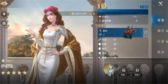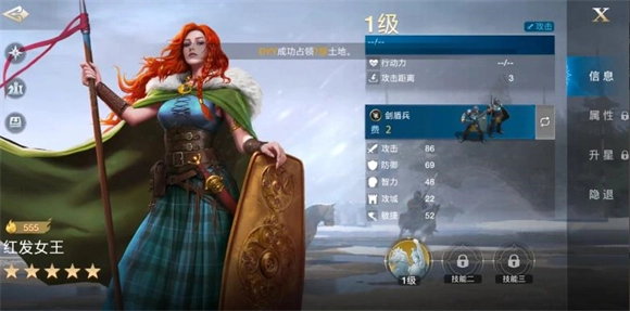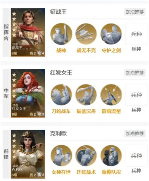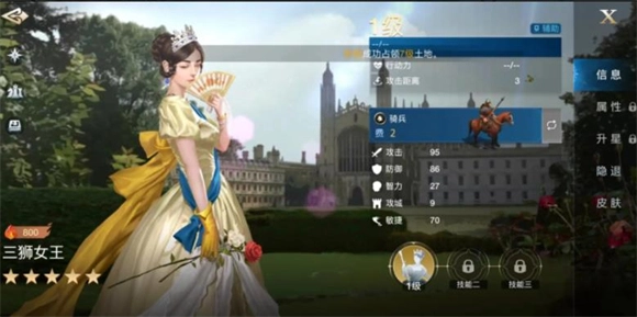 三狮女王定位辅助武将,兵种为骑兵,普攻距离3格。她的技能是【王冠】,这是一个开场触发的技能,生效范围2格,触发概率100%,属于前期能形成进攻压制的技能,可增强英雄的追击伤害与连击能力。该技能机制简洁直接,和拥有追击技能、高输出特性的英雄适配度很高。推荐的搭配组合有:雄狮王、三狮女王与铁公爵;库比、三狮女王与铁公爵;吉加美士、三狮女王与铁公爵。