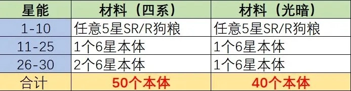 1黄星对应的是1星级,1颗红星等同于5颗黄星,而5颗红星也就是25星,这是星级的上限。四系角色升星时需要用到同系的狗粮角色,光暗系角色升星则只需要使用自身的本体角色。