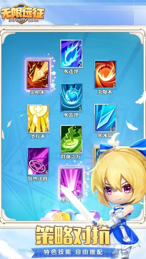 《无限远征》是一款集策略性与休闲感于一体的放置策略卡牌游戏。游戏打造了以光、暗、火、冰、草、水六大相互克制元素为核心的元素大陆世界观。玩家在游戏中需要招募不同职业的英雄,自由搭配出战阵容与最多八张法术卡牌,借助元素克制关系与技能组合,挑战主线关卡、试炼塔等PVE玩法,组建专属的开拓团,守护元素大陆的安宁。 该游戏融合了深度策略与轻松养成的双重特性:玩家可通过英雄装备、神器等养成系统提升战斗力,同时游戏提供开局无限十连抽与SSR自选机制,大幅降低养成门槛,让玩家既能体验策略博弈的乐趣,又能享受轻松护肝的养成过程。