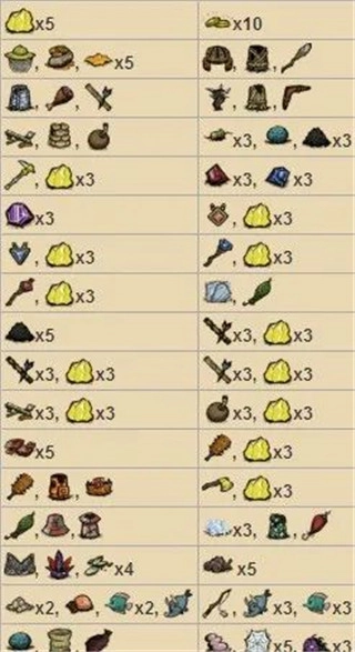 以下是交换列表(上面的是玩具类型、下面的是料理类型)