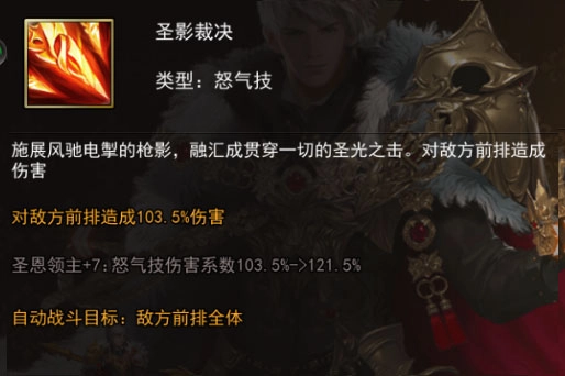 超怒气技:施展出风驰电掣般的枪影,汇合成能够贯穿一切的圣光之击,对敌方前排造成103.5%/121.5%的伤害。