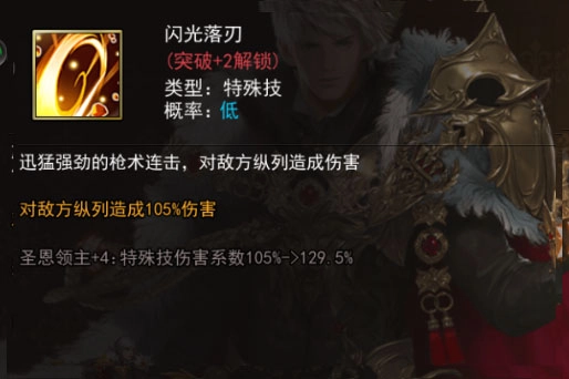特殊技:迅猛凌厉的枪术连击,对敌方纵列造成105%/129.5%的伤害