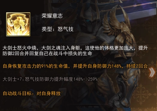怒气技:大剑士怒火升腾,大剑之魂融入躯体,令其身形愈发魁梧,同时恢复自身生命值并提升防御力,效果持续两回合。